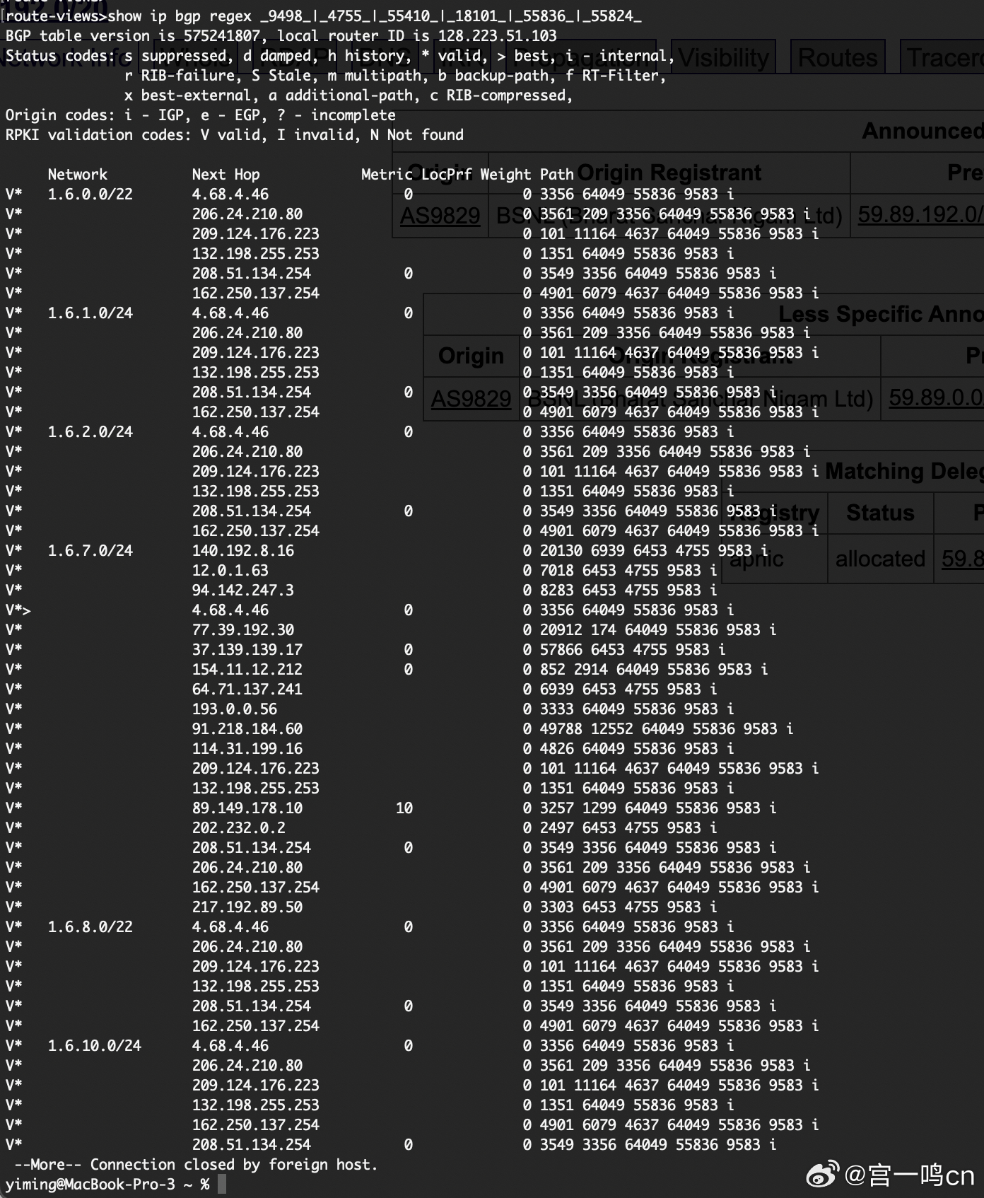 宫老师用的这个命令是显示与正则表达式匹配的路由, 用正则表达式过滤了 印度的 AS 自治域