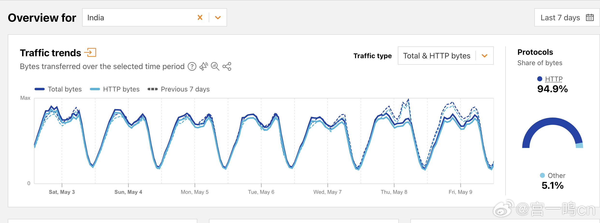 如果说通过 AS 路由来看是入站网络情况 那么 Cloudflare Radar 展示的就是出站网络情况,是所有访问了 Cloudflare 节点的流量情况,可以看到也是没有明显变化的