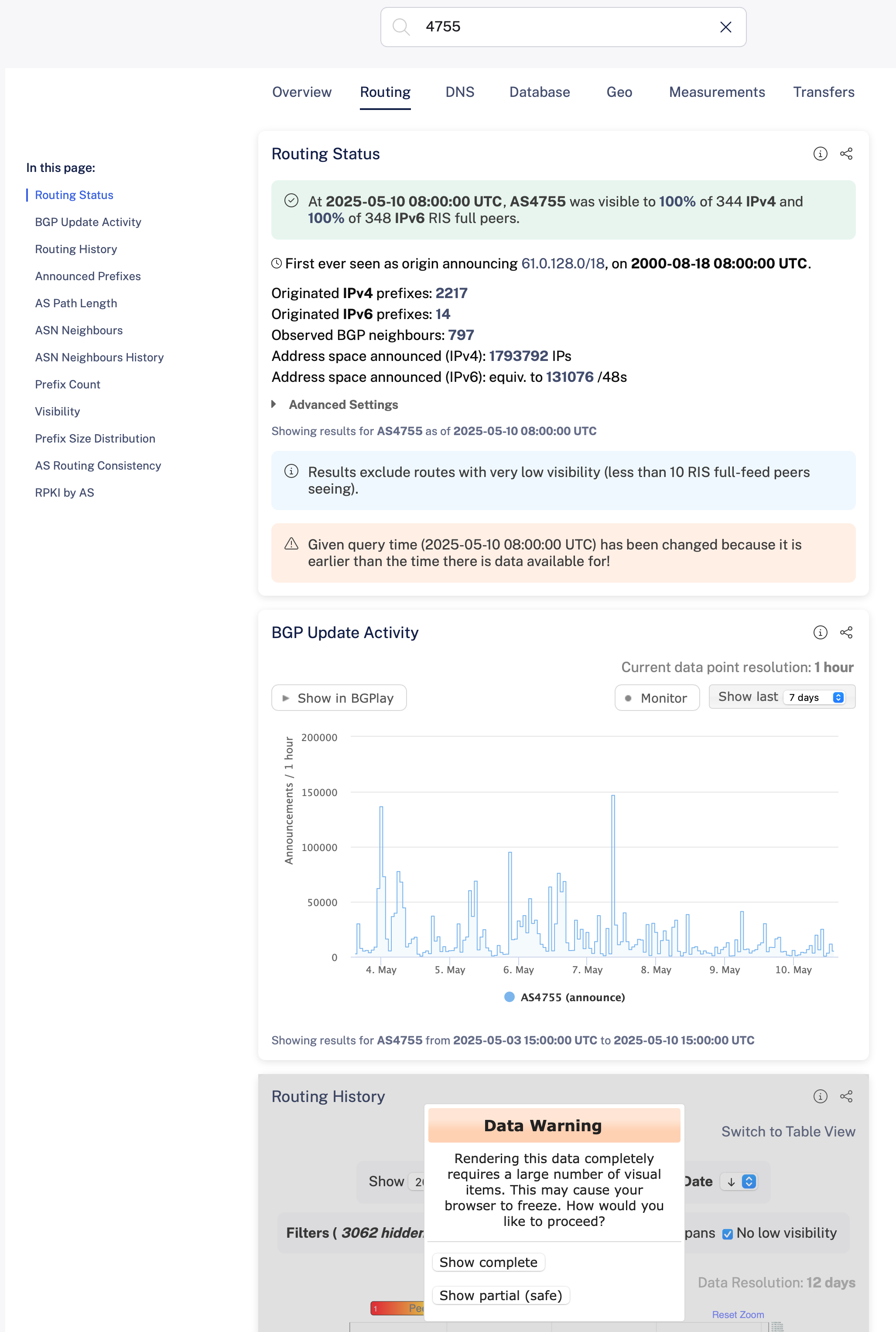 然后在查找相关资料的时候发现了stat.ripe.net 这个站点可以图形化分析自治域路由情况